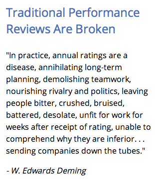 Deming is a man who does not mince his words. The performance review system is a disease indeed—and it’s spreading. I guess it’s a disease of the brain, as it causes executives and HR departments to continue doing exactly the same thing while expecting different results. Utter insanity.
